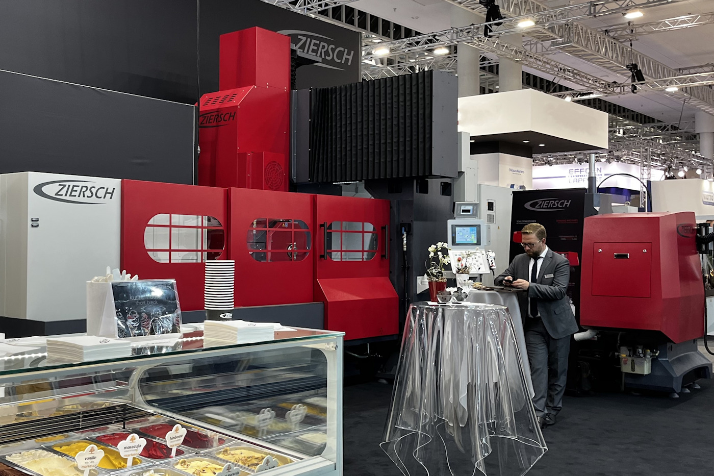 Ein großes Highlight war die Livepräsentation unserer Schleifmaschinen vor Ort. Angeführt von unserer beeindruckenden Doppelständerschleifmaschine Z 1020 sowie einer Flachschleifmaschine Z 24 und Rundschleifmaschine ZR 600 hat Ziersch auf einem ca. 100 m2 Stand, eher auf kleinerem Raum eindrucksvoll bewiesen, wie kompakt und platzsparend eine Produktion aus Kundensicht gestaltet werden kann.